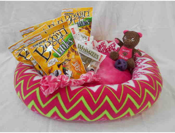 This girly polar fleece bed with 13 x 15-inch sleeping surface is perfect for your little princess. It's easy care, machine washable, perfect for your sweet girl. It comes stuffed with Beggin Littles which are made in the USA, Whimzee chews from Holland, a small soft toy, a rubber toy, and a braided tug toy, all of which have been donated by generous supporters of NMDR.