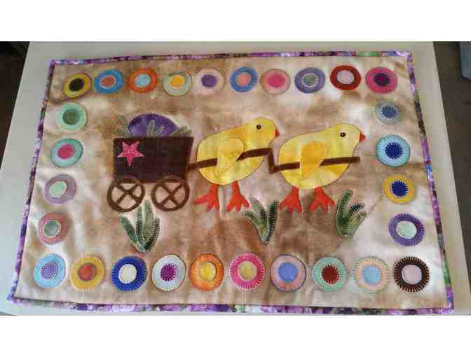 This is a beautiful piece of hand appliqued WOOL art. Two little chicks carting home their "Easter egg." There is a sleeve on the back to hang it on the wall. Top is all wool and hand appliqued. Back is a brilliant colored batik fabric (same as the binding seen in the picture). It measures approximately 17 inches by 26 inches. As you know, hand appliqueing takes a long time, but it's worth it.
