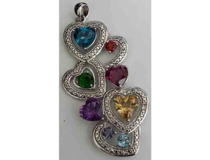 Beautiful pendant with multiple hearts in multiple colors. Lab created stones, eight stones in all, garnet, emerald, amethyst, ruby, citrine and more. Excellent pre-owned condition. About 1-1/2 inches long, purchased new from Zale's about three years ago.