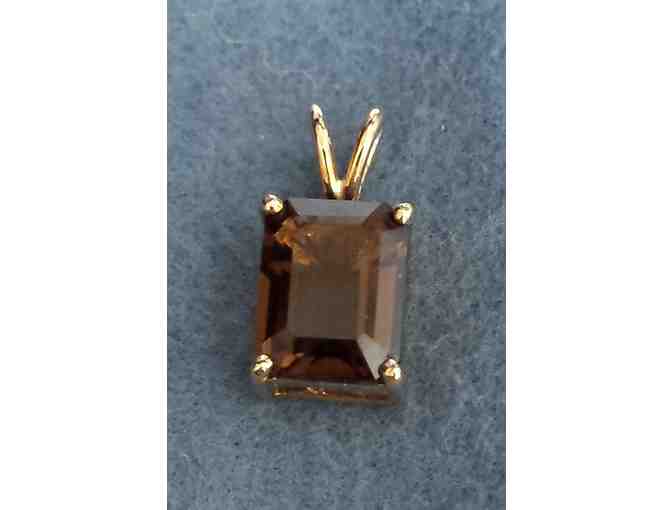 Smoky Topaz Pendant in 14K gold setting. 5/8 inches high and 1/4 inches wide, emerald cut. Marked 14K on back.