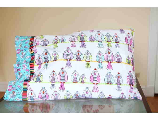 One handmade, brightly colored children's "Silly Birds" pillowcase.