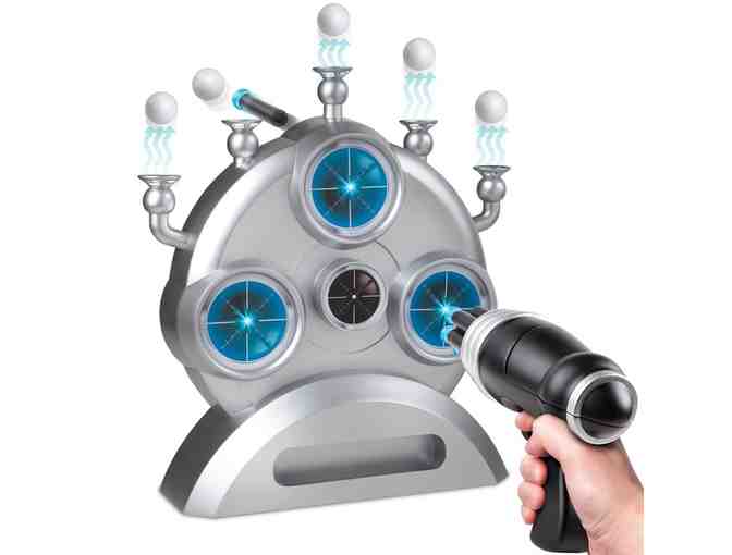 Exciting target action featuring 5 foam balls that literally float in mid-air. 5 floating targets, 6-barrel soft dart blaster with roating chambe. Uses 4'C' batteries not included.