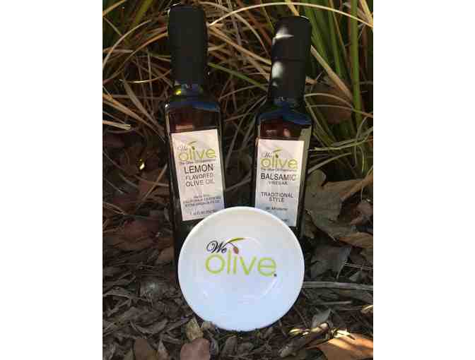 We Olive - Dipping Set. Includes one 8.45 fl oz bottle of Lemon Flavored Olive Oil, One 8.45 fl oz bottle of Balsamic Vinegar (Traditional Style) and one dipping bowl.