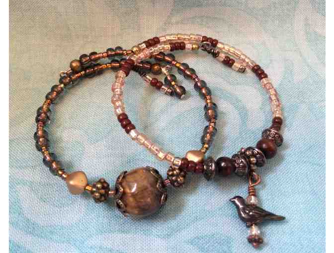 The winning bidder will receive these beautiful handmade beaded bracelets. One bracelet made of beautiful brown and gold beads and one bracelet made with brown and clear beads and a little bird charm dangling from the center.