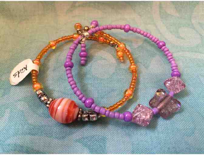 The winning bidder will receive these beautiful handmade beaded bracelets. One bracelet made of beautiful purple beads with a butterfly in the center and one bracelet made with orange beads with silver flower beads and a red and white swirled center bead.