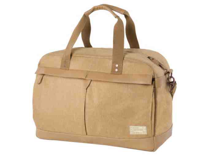 Modern profile Overnight Travel Bag includes roomy main compartment for plenty of clothing, 2 front pockets: one fleece-lined and padded for tablets and e-readers, and the other contains an organizer and room for phone, chargers, or accessories. The rear side of the bag boast a large padded exterior access pocket for your 13"-15" Macbook Pro or other similar sized laptop. Removable shoulder strap and constructed in an engineered linen blend that is treated for water resistance. Nude leatherette accents and gold strap webbing compliment the antique copper hardware to achieve a new look with a classic feel. Custom brown logo interior lining.