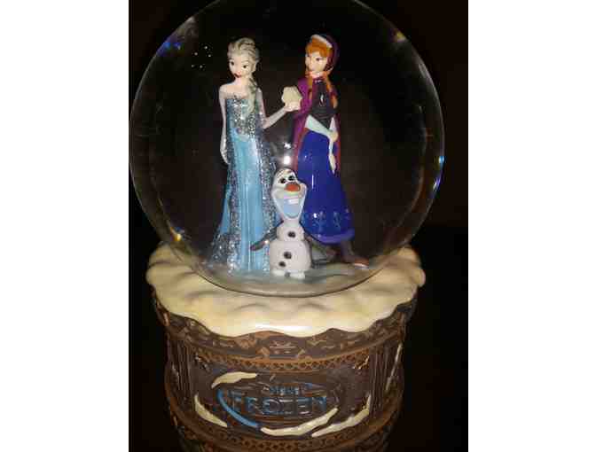 Beautiful snow globe of Disney's very popular movie "Frozen". Inside the snow globe are Olaf, Anna, and Elsa. It is in great condition, with no chips or cracks. Water inside snow globe is very clear. It has been displayed in a no smoking home. The snow globe plays the song "Let It Go". I do not have the original box, but will be packed with the utmost care and protection.