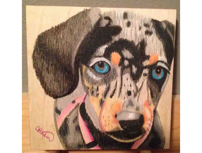 This is a hand drawn portrait of a beautiful blue-eyed Dachshund. Done in oil-based colored pencils on wood, it brings the Doxie's eyes to life. Portrait is 6x6 inches and is ready for hanging. Original, one of a kind piece.