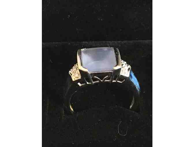Beautiful light blue chalcedony ring in 14k white gold. There are 3 really tiny diamonds on each side of the stone too. So comfortable and goes with blues and grays. I've worn this ring a lot and it still looks like new. You will love this ring.