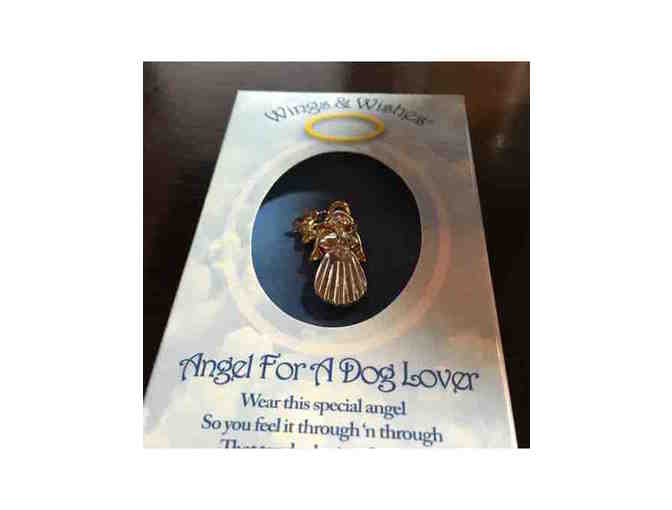 One-inch pin with angel and dog for your dog-loving friend or yourself! Wear this special angel so you feel it through and through that tender loving feeling for your dog so dear to you.
