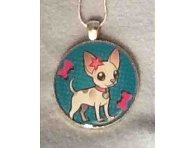 This brand-new necklace features a precious female Chihuahua that will make you smile from ear to ear. Purchased specifically for this auction, this cute Chihuahua came on a Pink Ball Chain, and I also purchased a nice silver chain, to "dress it up." BOTH chains can be sent to the winning bidder, so you will have a nice silver chain--AND the original cute Pink Ball Chain--to place the Chihuahua on, depending on your mood, and/or your outfit.