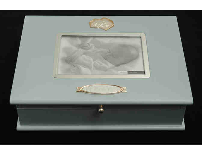 Looking for the perfect way to store baby's first precious keepsakes? This beautiful blue wooden memory box will keep those tiny treasures safe and look lovely on display. The top of the box has a glass frame for your favorite photograph, as well.
