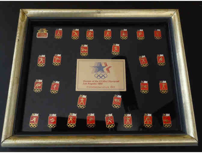 Limited edition of 1984 commemorative set of Olympic pins displayed in a wooden frame. Comes in the original 1984 "Games of the XXIIIrd Olympiad Los Angeles 1984" box.