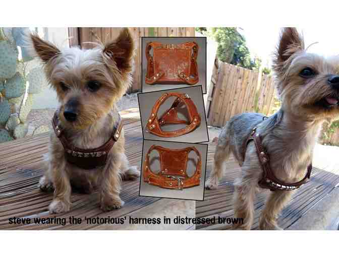 Woohoo for National Mill Dog Rescue!!! What about a bespoke handcrafted leather dog harness with your pup's name to let the world know who is top dog, all while sending some moolah so they can help more dogs? You are bidding on an adjustable fine leather harness made to measure for your dog in either distressed brown, black, red, blue or yellow top quality leather, handcrafted in Brooklyn and personalized with the Gangs of New Yorkie Notorious or Pound lettering.