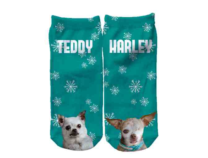 One pair of custom-designed Harley and Teddy ankle socks. No longer available for sale. Size small, new in package! Size chart: Women 5-9; Men 6-8.