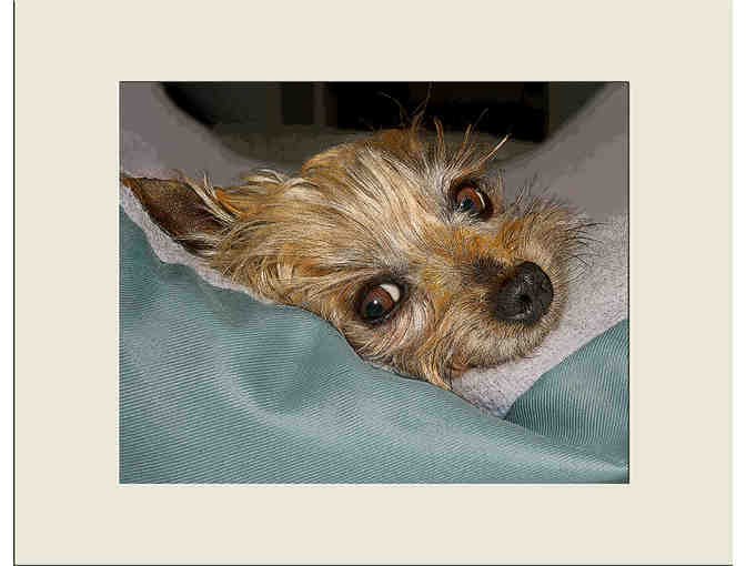 Offered for bid is this 8" x 10" original photograph, printed and signed by the artist and fully matted to fit into a standard-sized 11 x 14" frame (frame not included) of Asher a Yorkie who was rescued in 2014 by National Mill Dog Rescue and adopted by dedicated volunteer Mary Lou Cronin.