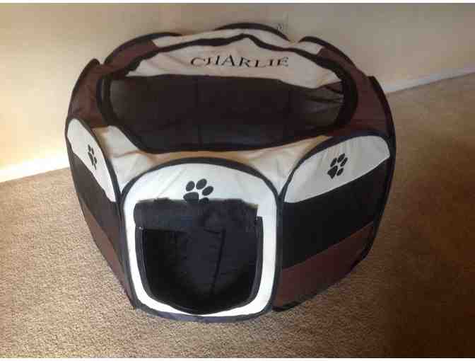 This 26" diameter by 19" tall soft sided octagon kennel folds up flat. It has one door on the side which zips shut as well as the entire top zips off. Perfect for a small dog or litter of puppies! It is brand new, but was a photo sample so has "Charlie" personalization on the top.