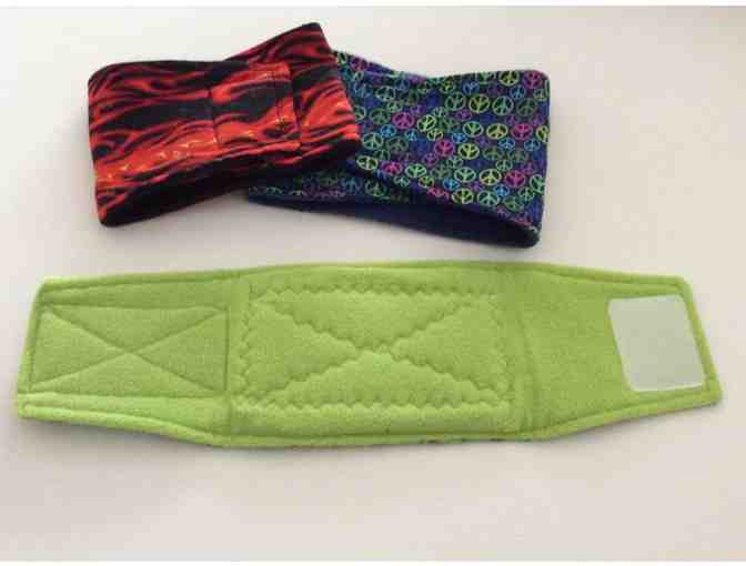 3 Male Dog Belly Bands in winner's choice of fabrics and sizes. These belly bands are reusable, washable and waterproof. No pad is needed because absorbent fabrics have been added to the center of each belly band. The value increases as the sizes go up!
