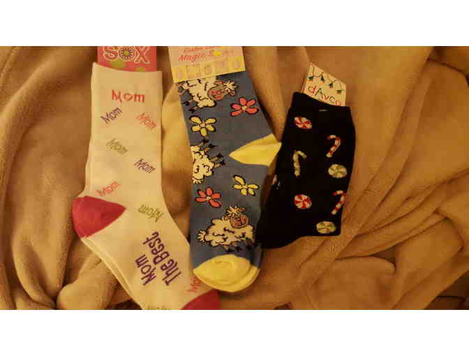 The winning bidder will receive 3 pairs of ladies socks, sized 9-11: 1st pair: white with pink toe/heel and pink, green and lavender printing that celebrates "Mom" 2nd pair: Wedgwood blue with yellow toe/heel and decorated with white lambs and flowers...perfect for Easter or springtime wear 3rd pair: black allover background with white Christmas candy designs, which are accented with cheerful red and green stripes. Let's start the bidding at $5...Happy bidding! Socks are from a smoke-free home. I do have a dog.