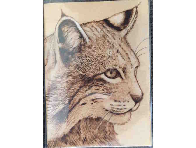 ACEO (Art Card Editions and Originals) Description - Original Bobcat Size: 2.5 x 3.5. Medium: Pyrography (burning) on thin wood. Artist: James D. Hicks. One of a kind!
