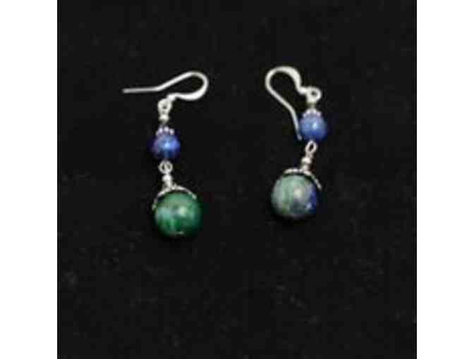 These unique blue and green earrings are sure to complete your look and can easily be dressed up or down. Handmade by Stacy Kvet using semi-precious stones and Czech glass, with silver embellishments.