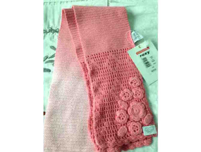 Roxy Girl crocheted scarf, pink, new with tag. 100% cotton with varying colors of pink and crocheted flowers at bottom.