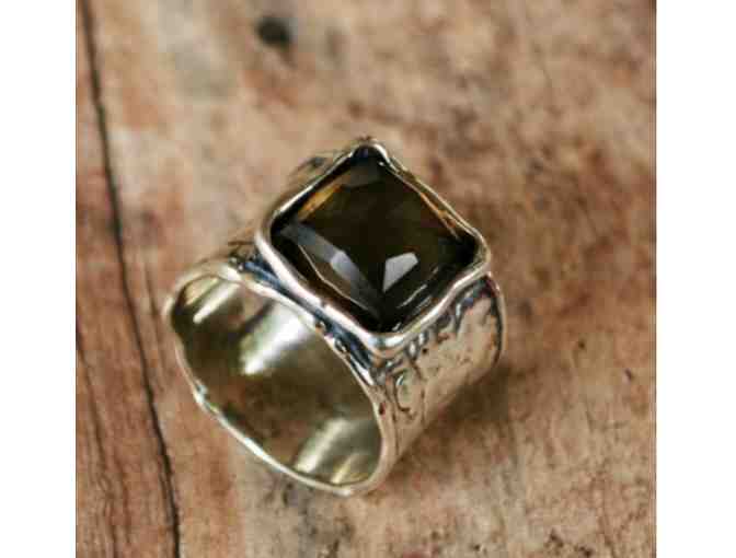 Size 10 Made by my favorite Colorado designer, Rockhill Designs. The checkerboard cushion cut of this deep smoky quartz allows it to flicker most intriguingly in the light. Handcrafted and set in a wide sterling silver band. Measures 1/2" from top to bottom.