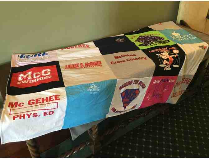 The blanket consists of 30 McGehee t-shirts stitched together backed with a soft cozy fleeze. 5'x6'.