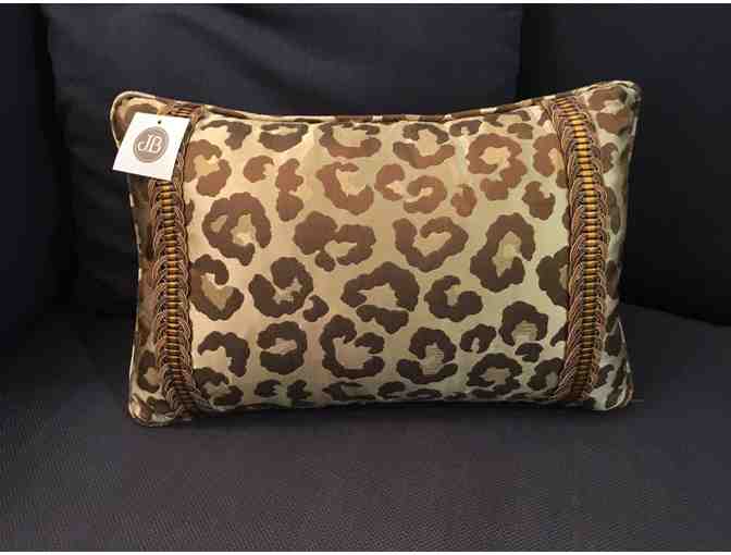 Rectangular silk animal print pillow with decorative braid and filled with down insert. 11"x17"