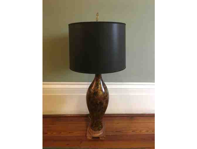 Tortoise shell painted lamp with black shade. Lamp with shade is 32" tall. Lamp base is 6" wide.