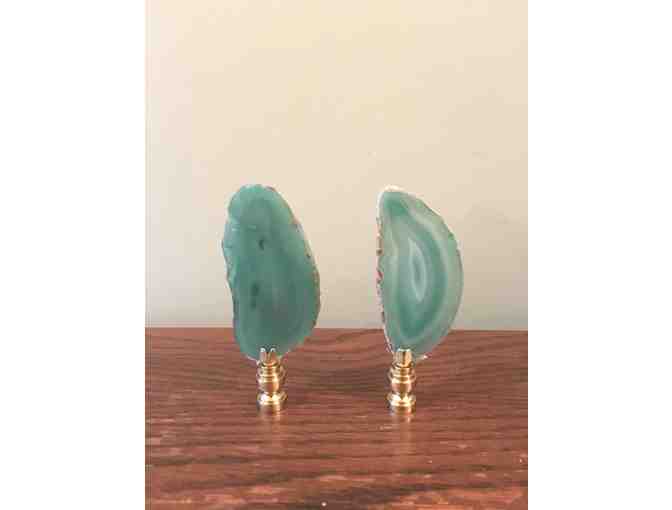 2 green agate lamp finials on brass base. Both are approximately 4 1/4" tall.
