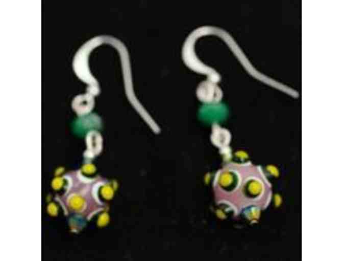 Show off your love of color and your unique style with these one-of-a-kind earrings, handmade by Stacy Kvet. Pink glass is dotted with white, blue, and green, and topped with a green crystal.