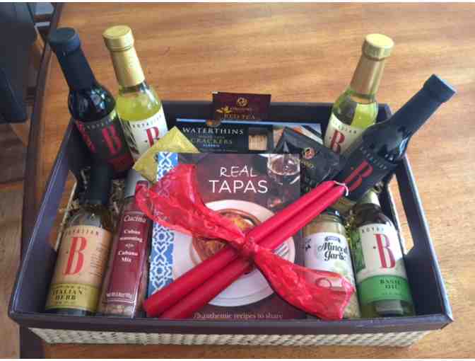 This Basket includes: Real ``Romantic`` Tapas - Enjoy a couples night ``in`` making tapas and enjoying each other`s company - candles included. Real Tapas Cookbook, 2 Garlic Olive Oil, Basil Oil, Italian herb with olive oil dipping sauce, pomegranate v