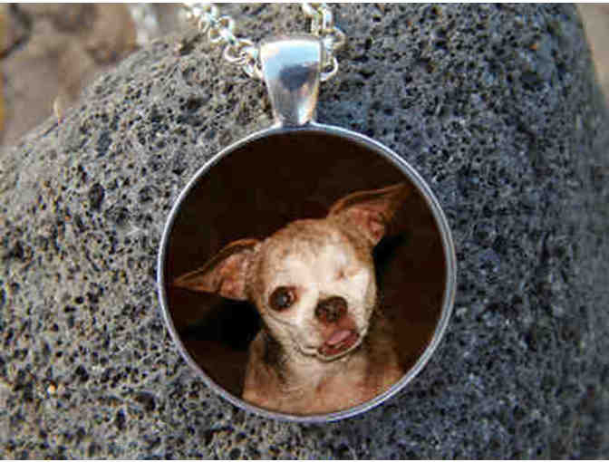 This beautiful pendant design captures Harley's sweet personality. Set in a 1 inch by 1 inch shiny silver finish pendant tray, with a 24 inch vintage chain necklace.