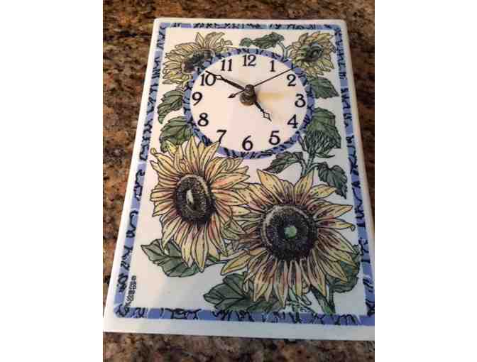 Distinctive porcelain clock featuring sunflowers. 6" x 9". A$50 value! Includes US shipping.