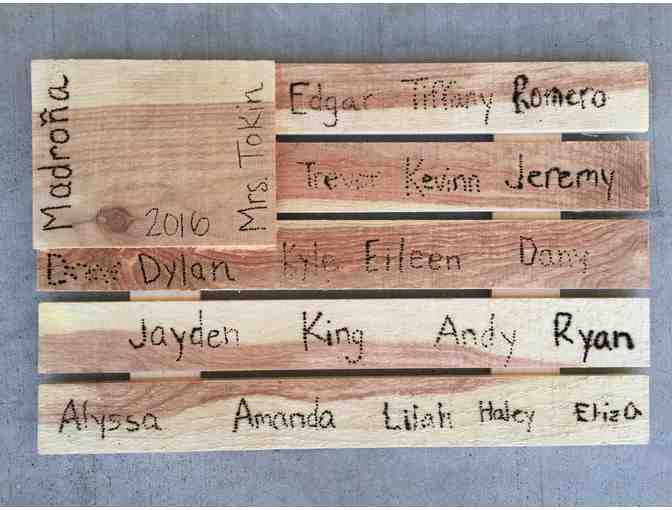 A beautiful rendition of our flag incorporating the ancient art of pyrography. The children burned their names into the wood creating a masterpiece befitting any decor.