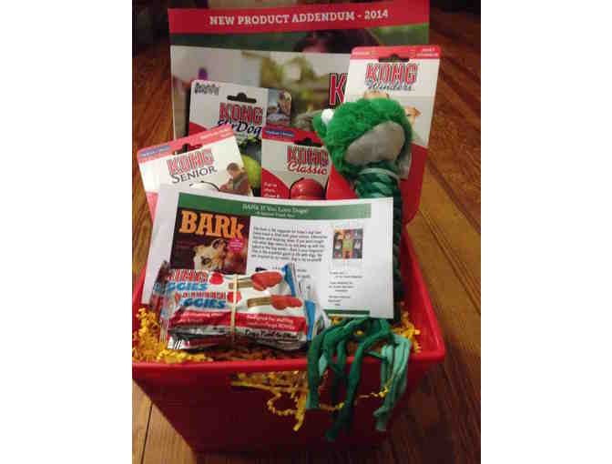 This auction item includes: toys by KONG: a frog winder, two (2) rubber treat inserts, and a tennis ball fetch toy; four (4) Ziggy KONG treats; and a year subscription to BARK Magazine!