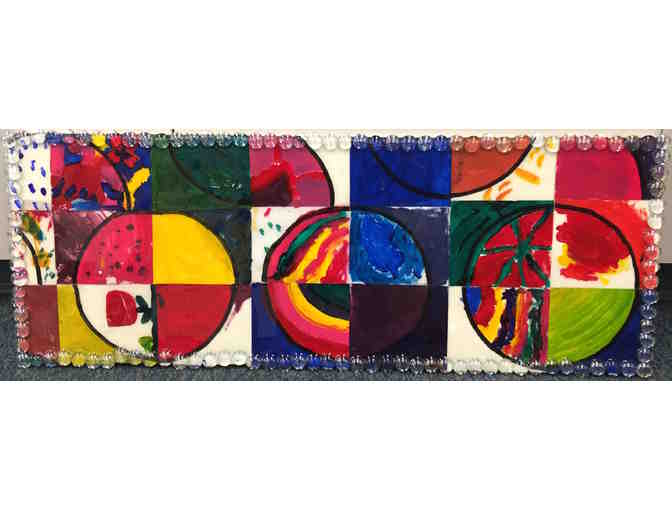 A stunning decorative piece made up of painted and glazed tiles and mounted on a wooden support. Each tile is painted by one of Ms. Wing's kids and together they are as colorful and fun as her classroom.