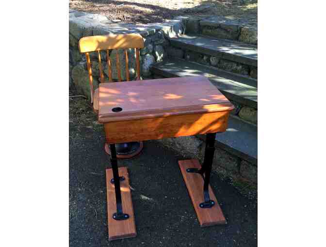Antique student desk with an inkwell and top that opens. The desk and chair have adjustable iron bases and the desk is already bolted to maple colored plank of wood but can be bolted to the floor along with the chair base. The base of the chair is stamped with `` Kenney Bros and Wolkins, Boston, Mass.`` The chair and top of the desk are in great condition as well as the inside of the desk. These companies merged in 1930 and started making furniture under the Kenney and Wolkins name.