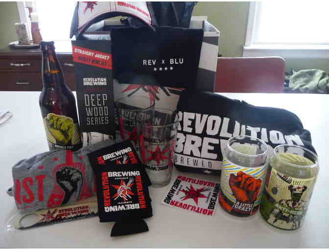 Also included are a Revolution branded hoodie, t-shirt, baseball cap, and scarf, 2 bombers of their specialty brew, 2 logo glasses, 2 can glasses, a church key and some other Revolution swag.