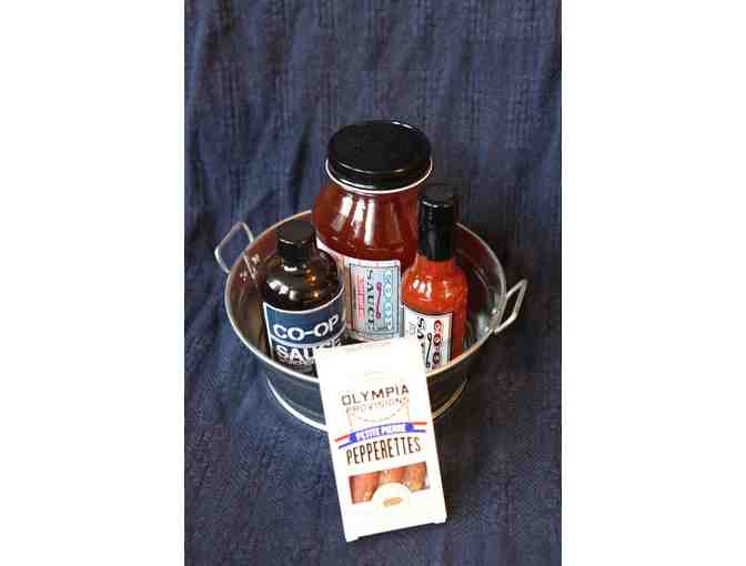 Everything you need for world class Bloody Marys, just add vodka! Locally sourced and produced Bloody Mary mix, Worchestershire sauce and "ChChCherry Bomb" hot sauce from Edgewater's own Co-op Sauce, plus Petite Pierre Pepperettes smoked pork sticks from Olympia Provisions for the type of garnish that changes a drink to a meal - all presented in a galvanized metal mini-tub.