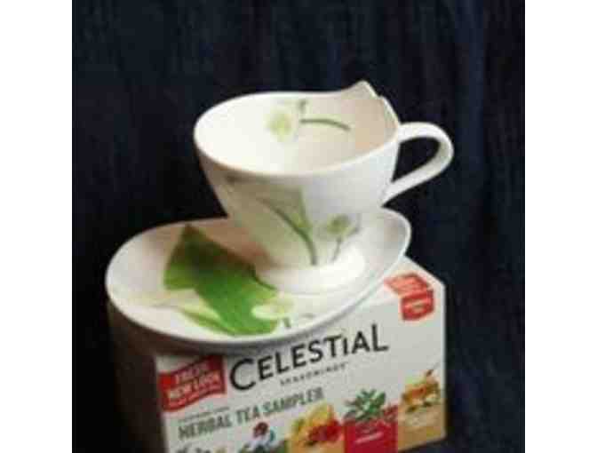 Beautiful and distinctively shaped tea cup and saucer set with calla lily design in a satin lined gift box, paired with a box of Celestial Seasonings Herbal Tea Sampler with 18 caffeine-free tea bags. A great gift for Mother's Day, or a lovely addition to your table!