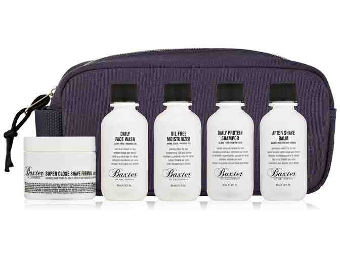Baxter of California - Stylish travel kit for men with TSA-approved, travel-ready bottles of daily face wash, oil free face moisturizer, oil free shave cream, super close shave formula, after shave balm and daily protein shampoo, all in a custom navy quilted dopp bag.