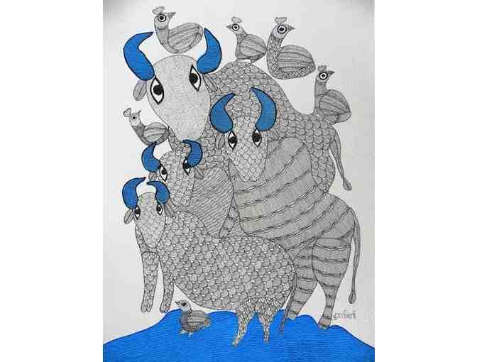 The Gonds paint local flora, fauna and gods. Traditionally made on festive occasions, Gond paintings depict man’s relationship with nature. The artists use natural colors derived from charcoal, colored soil, plant sap, leaves, and cow dung. This mystical art form is created by putting together dots and lines. The imaginative use of the line imparts a sense of movement to the still images. The paintings are an offering in worship of nature, and are also a mode of seeking protection and warding off evil.
