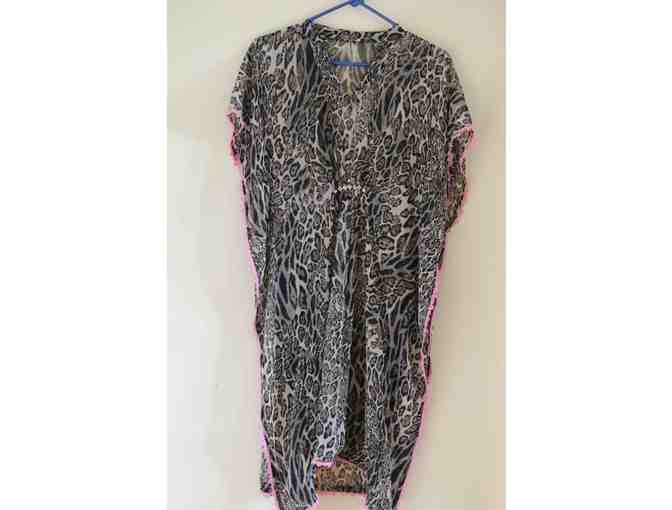 Leopard print sheer Kurta (sleeveless tunic) with custom sparkly pink center broach hand made by a FTCNS grandmother.