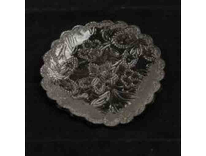 Floral motif display dish. Glossy black. Ceramic, made by Cats Paw Pottery. 6" in diameter.