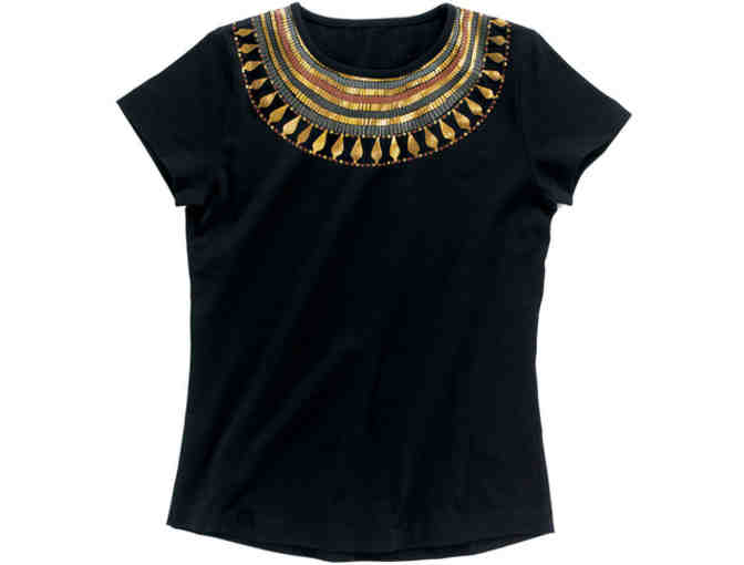 This T-shirt from the Metropolitan Museum of Art in New York City, USA is based on a broad collar from the tomb of Lady Senebtisi (Middle Kingdom, ca. 1859–1813 B.C.) discovered by the Museum’s excavators during their 1906– 1935 Egyptian Expedition. The broad collar necklace is particularly evocative of ancient Egyptian royalty and decadence, as it is crafted of gold and turquoise, faience, other stone beads, and fringed with gold pendants.