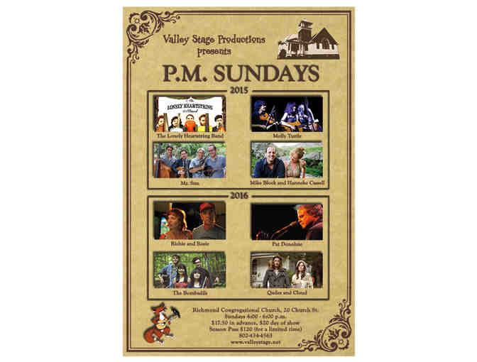 Season Tickets to PM Sundays Music Series presented at the Richmond Congregational Church beteen October and November from 4-6pm on Sunday afternoons. Out of area touring acts.