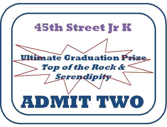 Winner and one friend will join the Jr-K teachers for breathtaking views and delicious treats! We will go to Rockefeller Center to the Top of the Rock to see the NYC skyline, followed by a trip to Serendipity for amazing sundaes!