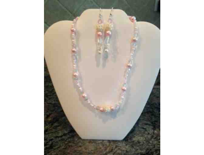 A lovely set to accent your spring wardrobe! Pink, white and crystal beads adorn this necklace and chandelier earring set. Handmade by Ossining's own Sandy Sileo, these pieces are sure to fetch you some compliments!